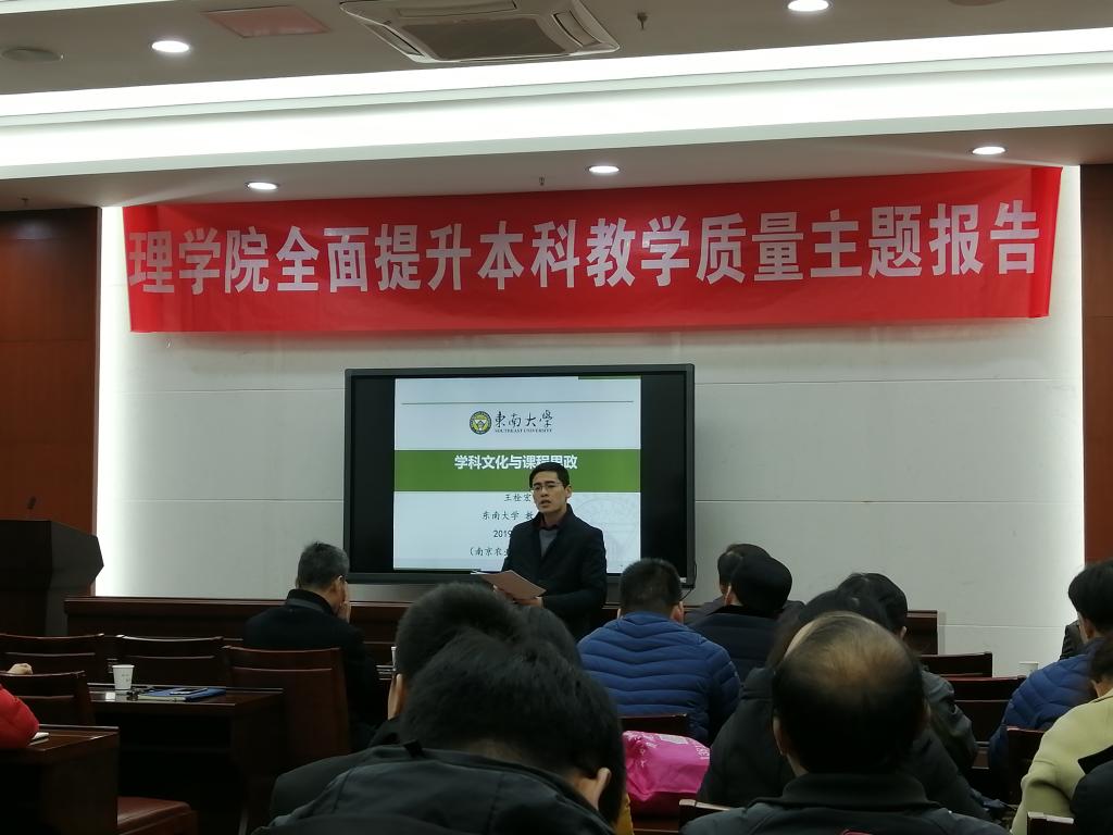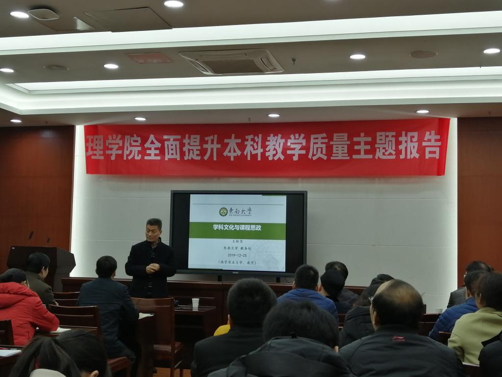 2019年12月25日下午2:30,cos色情 教师职业发展助推计划----名师讲堂第二期如期展开。数学系邀请东南大学教务处副处长王栓宏教授做了题为“科学文化与课程思政”的主题报告。报告由cos色情 副院长朱映光教授主持,教务处缪副处长,cos色情 章维华院长及部分数理化教师参加了报告会。