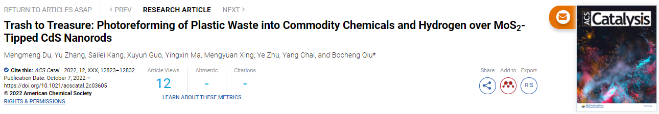 邱博诚教授课题组在催化领域旗舰期刊ACS Catalysis发表题为“Trash to Treasure: Photoreforming of Plastic Waste into Commodity Chemicals and Hydrogen over MoS2-Tipped CdS Nanorods”最新研究成果。