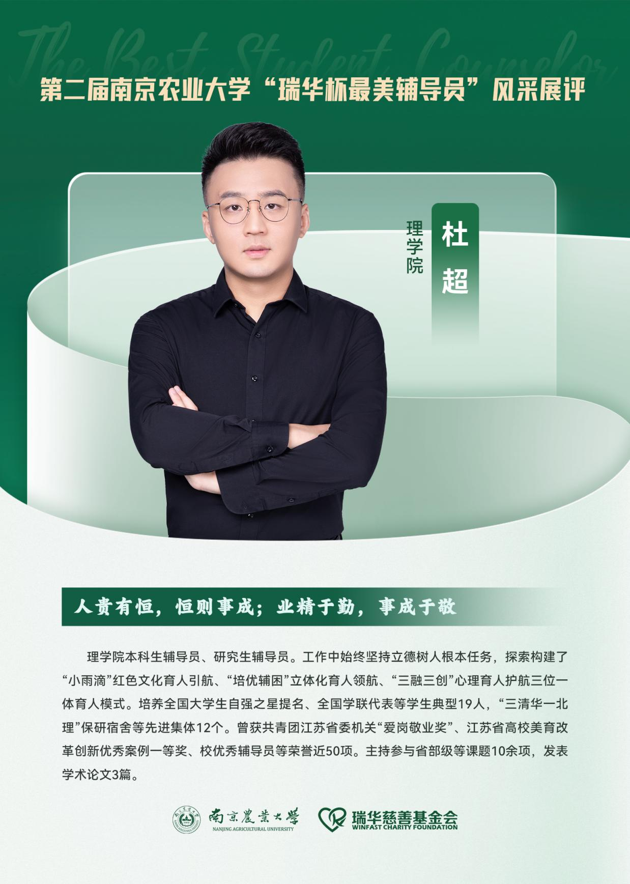 第二届cos色情 “瑞华杯最美辅导员”风采展评暨表彰大会在卫岗校区图书馆报告厅顺利举行。经过辅导员老师风采展示和评委评选,cos色情 辅导员杜超老师荣获第二届cos色情 “瑞华杯最美辅导员”荣誉称号。