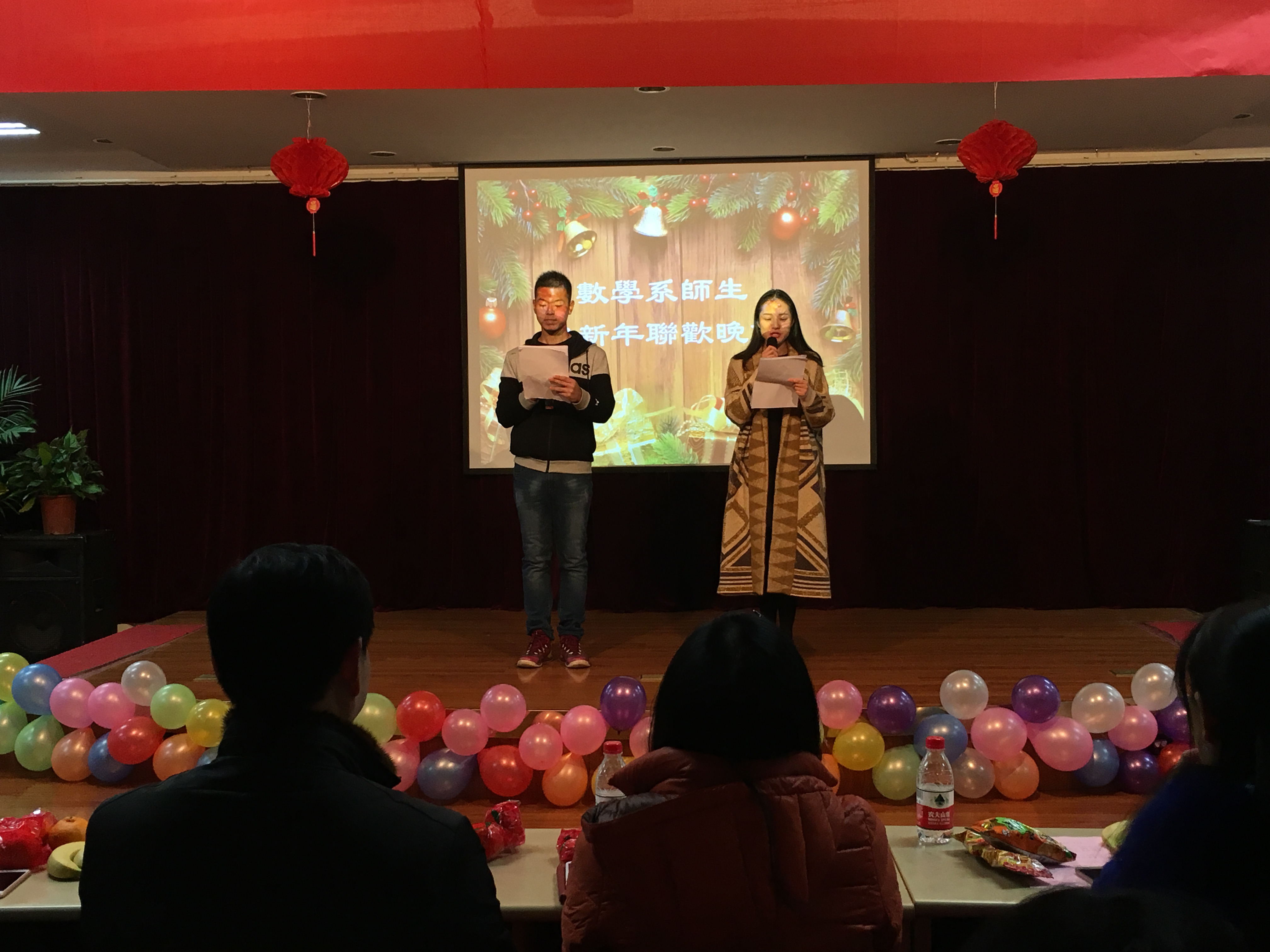 在短暂的开场视频之后,来自信科161班的雍乾和信科151班的陈悦同学作为此次晚会的主持人致开场辞,表达了对各位老师一直以来教书育人的谢意以及对全体数学系学生的美好祝愿。