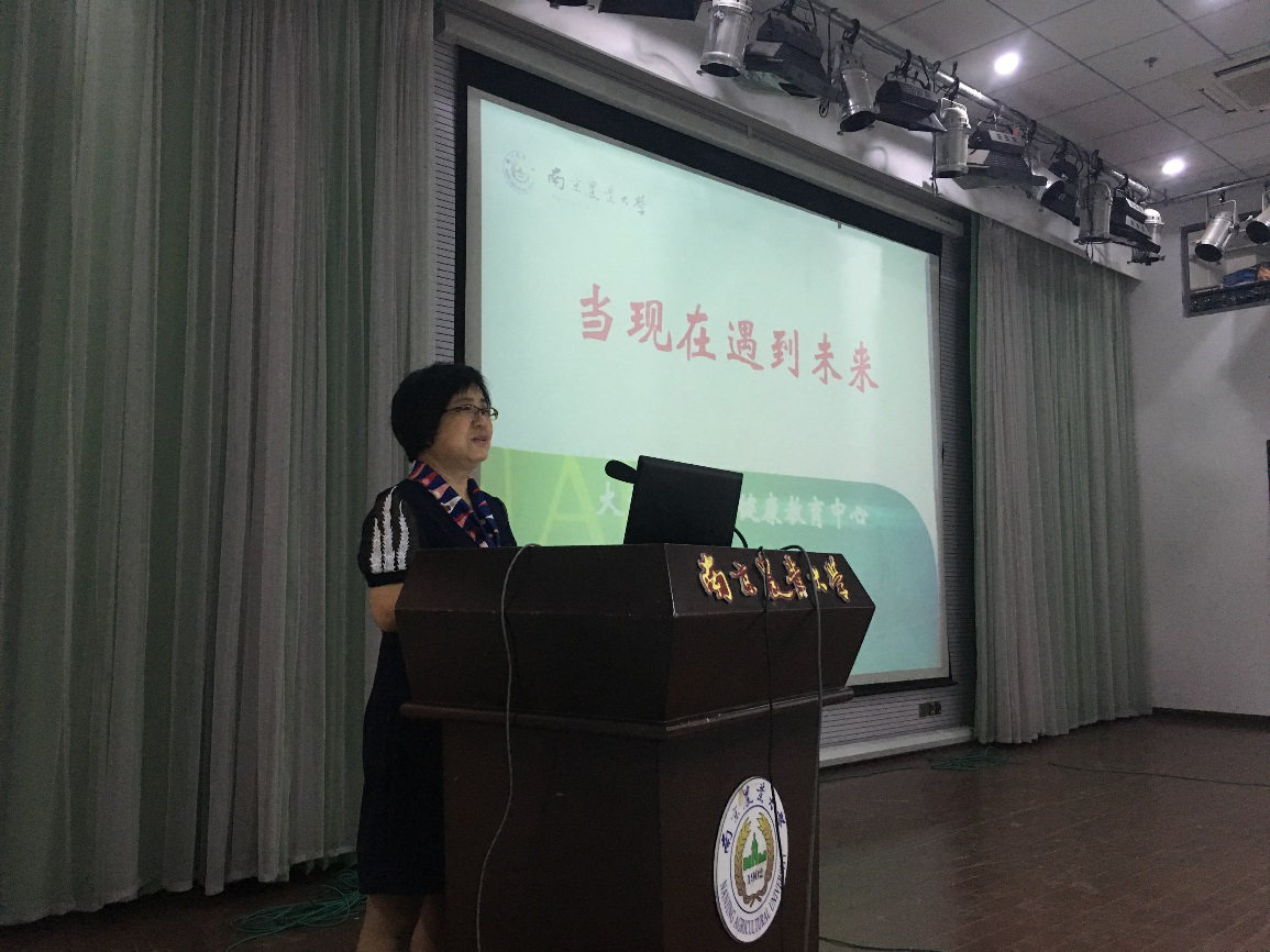 首先,徐梅主任做了以《当现在遇到未来》为主题的心理调适讲解。徐主任从高中和大学的区别谈起,分享度过四年大学生活的关键是:适应、调整和发展。学会调整才能适应,学会适应才能发展,每一个当下过好了就是未来。通过列举学长学姐最遗憾的八件事,提醒新生要在有限的四年时光里做自己认为值得的事,获得独立生活的能力、学习能力等,获得良好的人际关系,度过快乐大学生活。