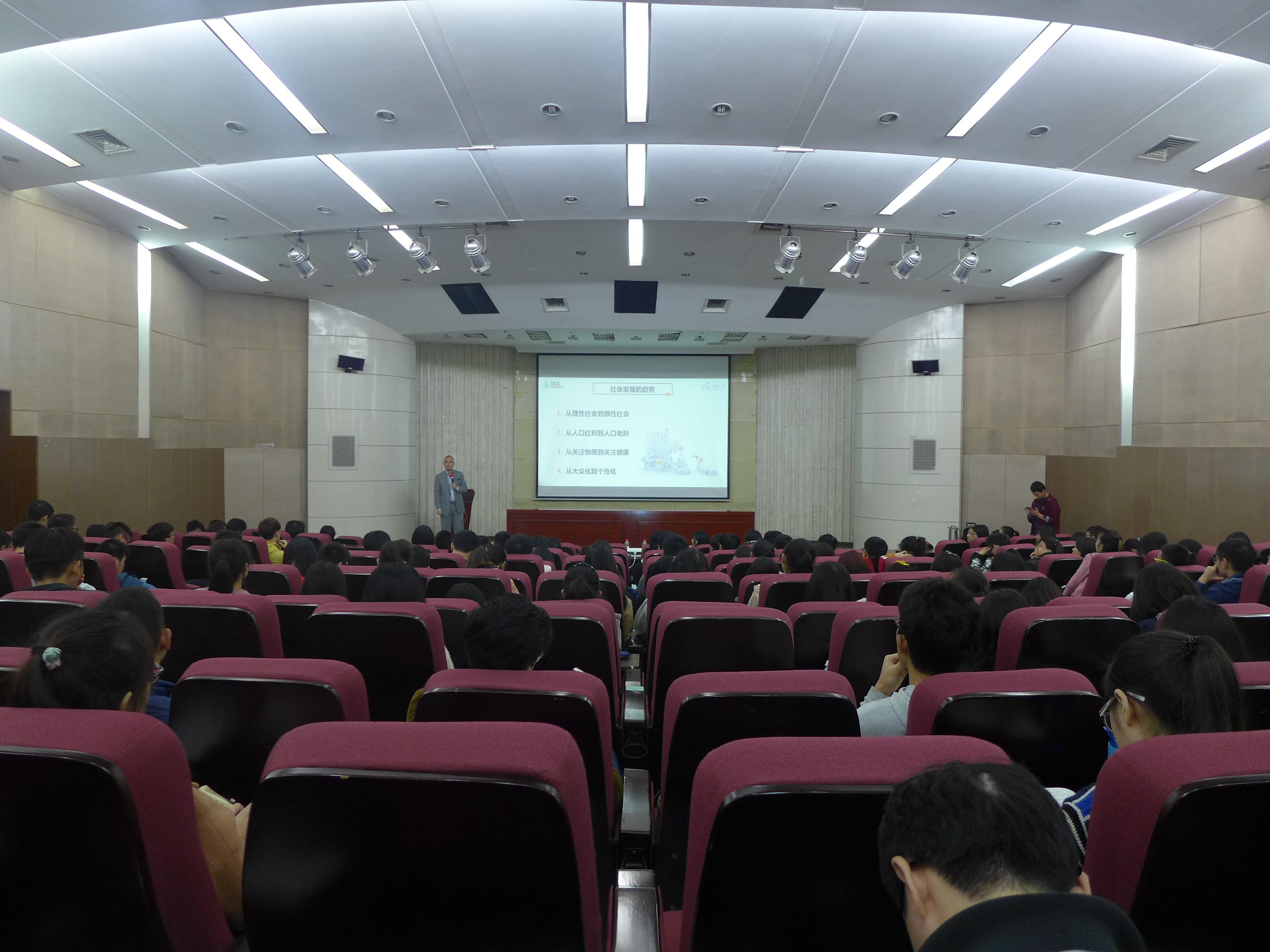演讲开始前,姜爷先采访了三位大三同学,提问他们前来参加讲座的原因,三位被采访的同学都表示是为了找到更好的、更为高薪的工作,却又处于没有方向的迷茫中,所以想来听听姜爷的讲座,想要获得一些启迪。