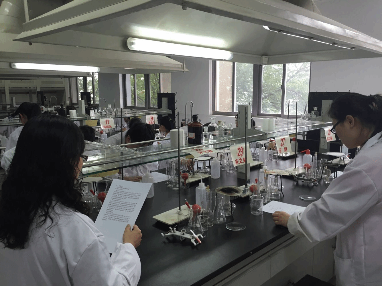 开幕式一结束,参赛选手纷纷前方理学楼开始准备比赛。抽到奇数的同学来到了2楼做无机实验,偶数号同学来到了四楼做有机实验。比赛一开始,选手们镇静的阅读竞赛试题,这次无机实验要求制备三水合三草酸合铁酸钾,有机实验则是安息香缩合反应。很快,选手们开始进入状态,开始清洗仪器,称量反应物为实验做准备。