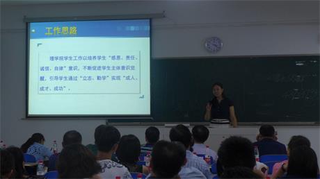 今天参加会议的领导有党委书记程正芳老师,院长章维华老师,副书记刘照云老师,副院长吴磊老师,以及信科1班班主任陈智老师、应化1班班主任徐峙辉老师以及辅导员吕一雷老师和周玲玉老师。首先章维华院长向家长们概括介绍了这次家长会的主要内容,也向家长介绍了本院的历史、专业、规模、师资力量等,让家长们更好地了解本院。就大学的成绩方面,吴院长向家长们重点介绍了本校的绩点制,对于不及格的同学,学校会安排一次免费的补考;本校不久后可能能够无门槛转专业,但是老师也指出转专业也需要进行审核;同时吴院长也告诉家长学业警告和毕业的绩点要求,希望家长能注意。就如何更好地度过大学,刘照云副书记通过优秀学生的成长之路对家长提出建议,希望家长能帮助孩子确立目标;对于课余时间,刘书记建议学生参加社团或学校活动锻炼能力、提高综合素质,但是社团最好只参加一个,过多反而会适得其反;由于大学和高中的学习是不同的,刘照云副书记建议学而生做好学习方式、时间管理方面的转变,过一个不一样的大学;道德教育方面,书记指出会通过不同方式做好新生的入学教育,走好大学第一步。