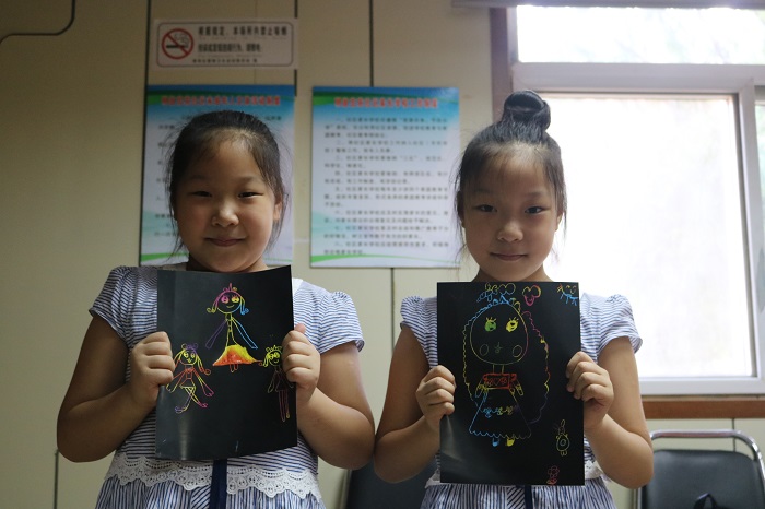 小朋友展示刮画作品