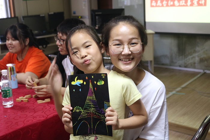 随后进行的“手工纸花”与“刮画纸”活动,用简单的材料、丰富的色彩,激发小朋友的热情,提高他们的动手能力。看着孩子们如花的笑靥,队员们也体会到了一种付出过后的欣慰。