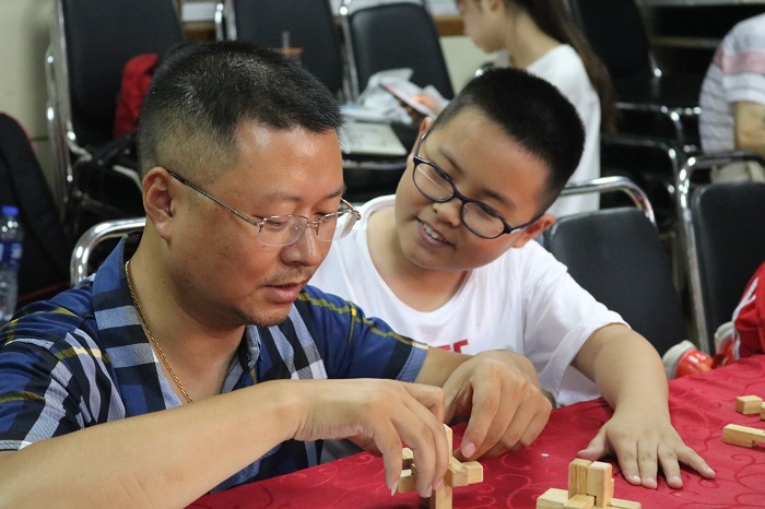 小朋友与家长一起玩鲁班锁