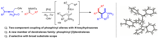 蕨烯类化合物(dendralenes)是多共轭烯烃的一种,因其平面构造类似蕨类植物的叶茎而得名。多共轭双键的存在使得蕨烯可以迅速构筑结构复杂而新颖的生物活性化合物,近年来成为合成方法学领域的研究热点。该课题组以氧膦取代联烯和酰腙类化合物的新型偶联反应高效实现了一类结构新颖的有机膦[3]蕨烯合成。研究发现多取代基的存在使得多个双键在空间中形成类似“风扇叶”的结构,且氧膦取代基的存在赋予各个双键有不同的化学反应性质。该有机膦蕨烯还被运用于分子内环化合成多取代茚和选择性氧化反应构筑氧杂-蕨烯。