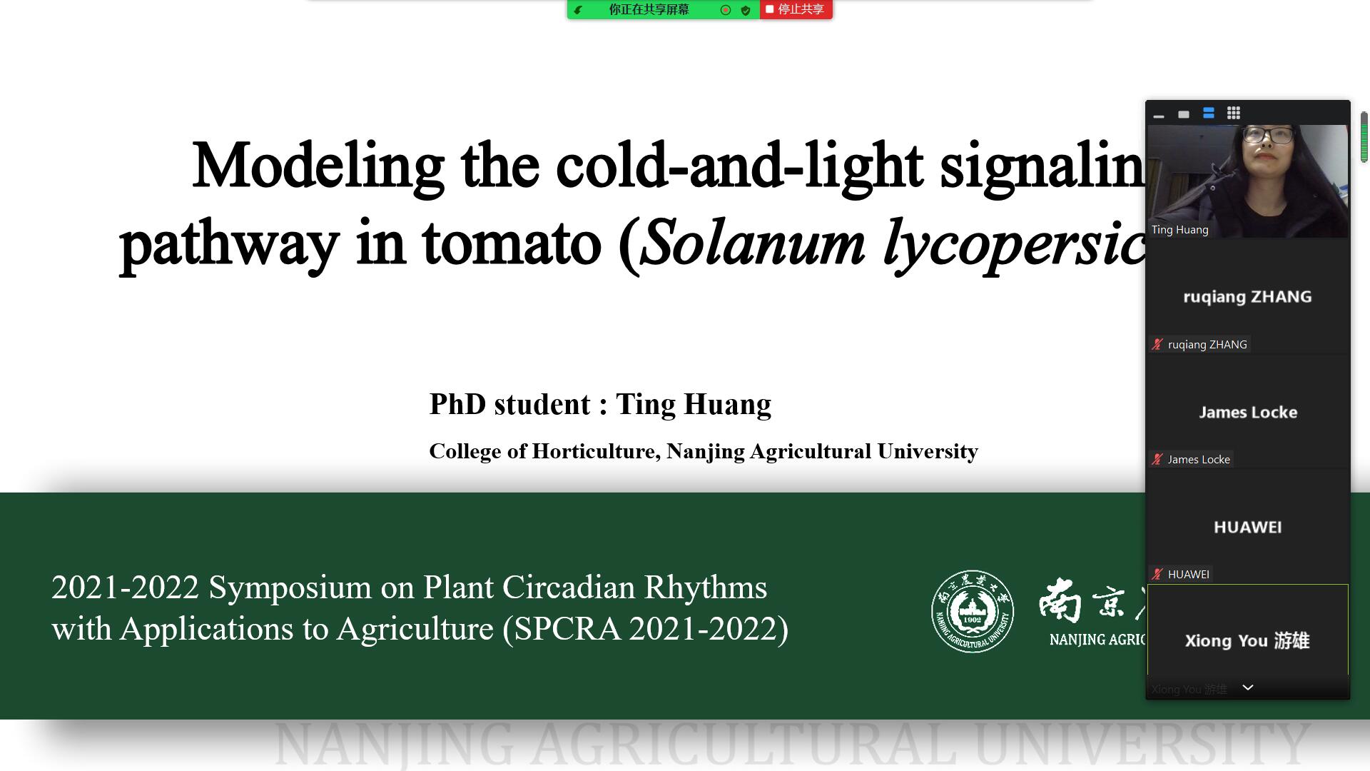 园艺学院博士生黄婷等也做了专题汇报,专家分别给予点评和建议。来自中国、美国、英国和尼日利亚的70多位专家和青年学者参加了这次会议。 会议结束时,与会专家学者一致表示,植物生物钟是当前生物学研究的热点课题,在农业生产中具有广阔的应用前景,希望以后多举办类似会议,加强进一步的交流和合作。