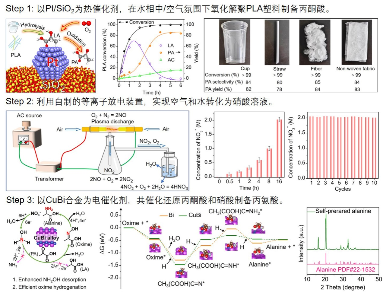 针对上述问题,研究团队开发了一种热化学-等离子体-电化学多场耦合系统,实现以废弃PLA塑料为碳源,空气为氮源,高效合成丙氨酸。该集成系统通过三步协同转化实现:首先,采用负载型Pt/SiO2热催化剂,在140 °C和1 MPa空气压力下,以水为绿色溶剂且无需碱加入,氧化解聚PLA塑料,实现80%的丙酮酸产率和81%的选择性;其次,通过自主设计的等离子体放电装置,在常温常压下将空气高效活化为氮氧化物,并经水吸收转化为硝酸溶液;最后,将上述两步产物直接混合无需纯化,并引入电化学反应器,利用晶格应力驱动的CuBi合金电催化剂实现丙酮酸与硝酸根的协同电化学还原,选择性合成丙氨酸。