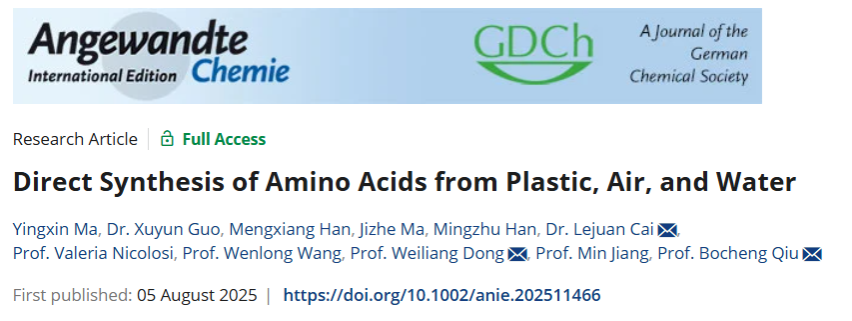 邱博诚教授团队在化学化工类顶级期刊《Angewandte Chemie International Edition》在线发表题为“Direct Synthesis of Amino Acids from Plastic, Air, and Water”的研究论文。该研究首次实现了以废弃聚乳酸塑料(PLA)、空气和水为原料直接合成高值化学品丙氨酸。