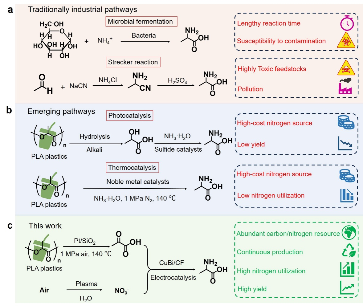 丙氨酸广泛应用于食品、医药及饲料等领域。2024年,全球丙氨酸市场规模达2.4亿美元,预计到2030年将增至3.5亿美元,年均复合增长率为5.8%。然而,丙氨酸传统合成路径存在效率低、能耗高、经济性差等瓶颈。尽管现有的光催化和热催化技术已实现丙氨酸的合成,但这些过程仍依赖由高能耗、高碳排放的哈伯工艺制备的氨作为氮源,此举带来了严重的环境与能源负担。