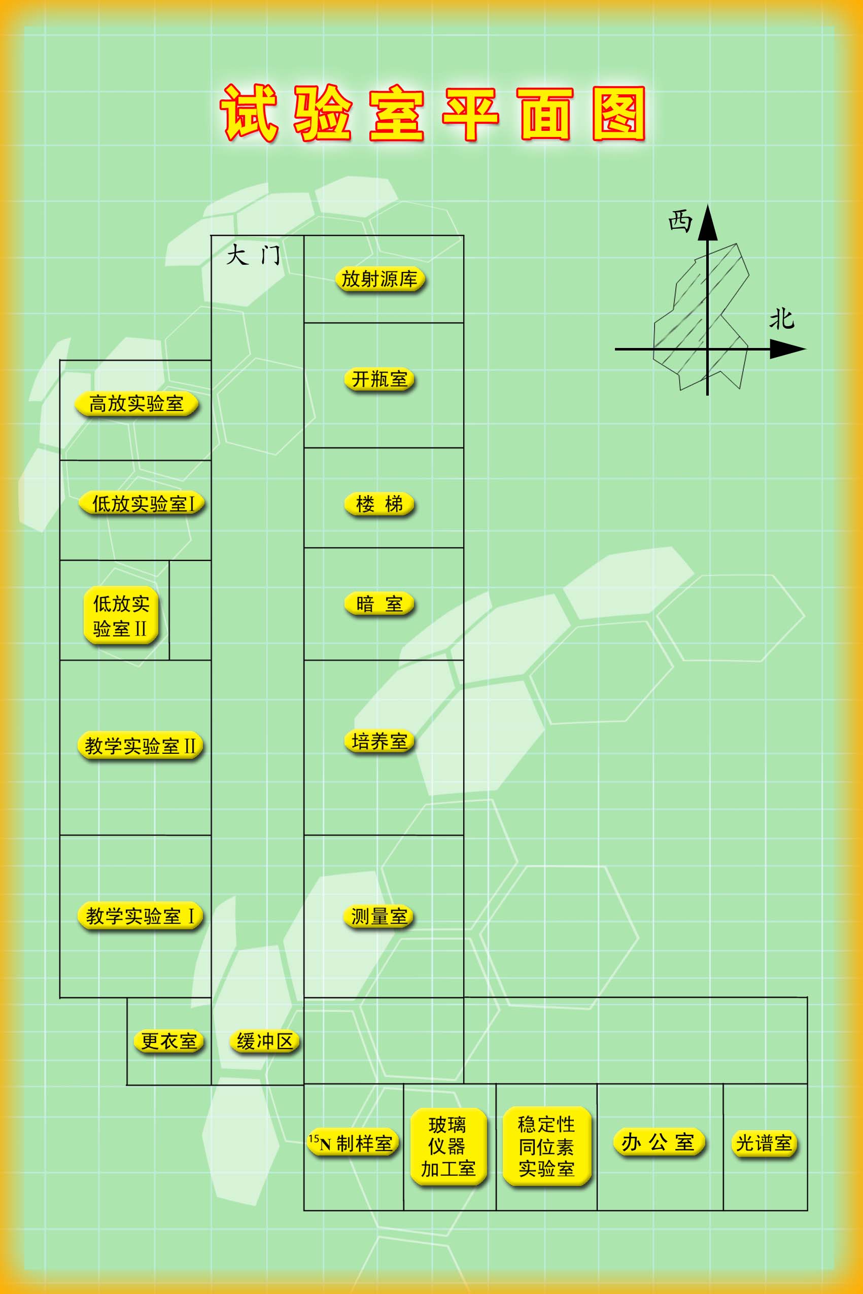 现有同位素实验室为2004年新建,分为放射性实验区和非放射性实验及办公区,在两区中间设有缓冲区、更衣室。放射性实验区内各实验室根据操作放射性活度的强弱依次排列。活度最强的放射性源库在整个放射性实验区的最深处,依次为开瓶室、高放实验室、低放实验室、暗室、培养室、教学实验室,活度最弱的测量室在最外端,紧靠缓冲区。各实验室均设有独立的放射性排水系统。